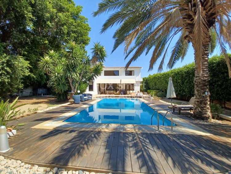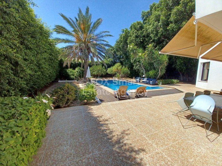 Unique three bedroom house, with a private pool, 1176sq.m. the plot, in a residential area. The house is very private, with fence around, huge garden with many trees. On the lower floor there are two living rooms with dinning and a fire place, kitchen, laundry room, quest w/c. A covered veranda looking at the garden and a garage for two cars. On the upper floor has tree spacious bedrooms, en suite master bedroom, two bedrooms and a whole bathroom. All bedrooms have big wardrobes, and storage thr...