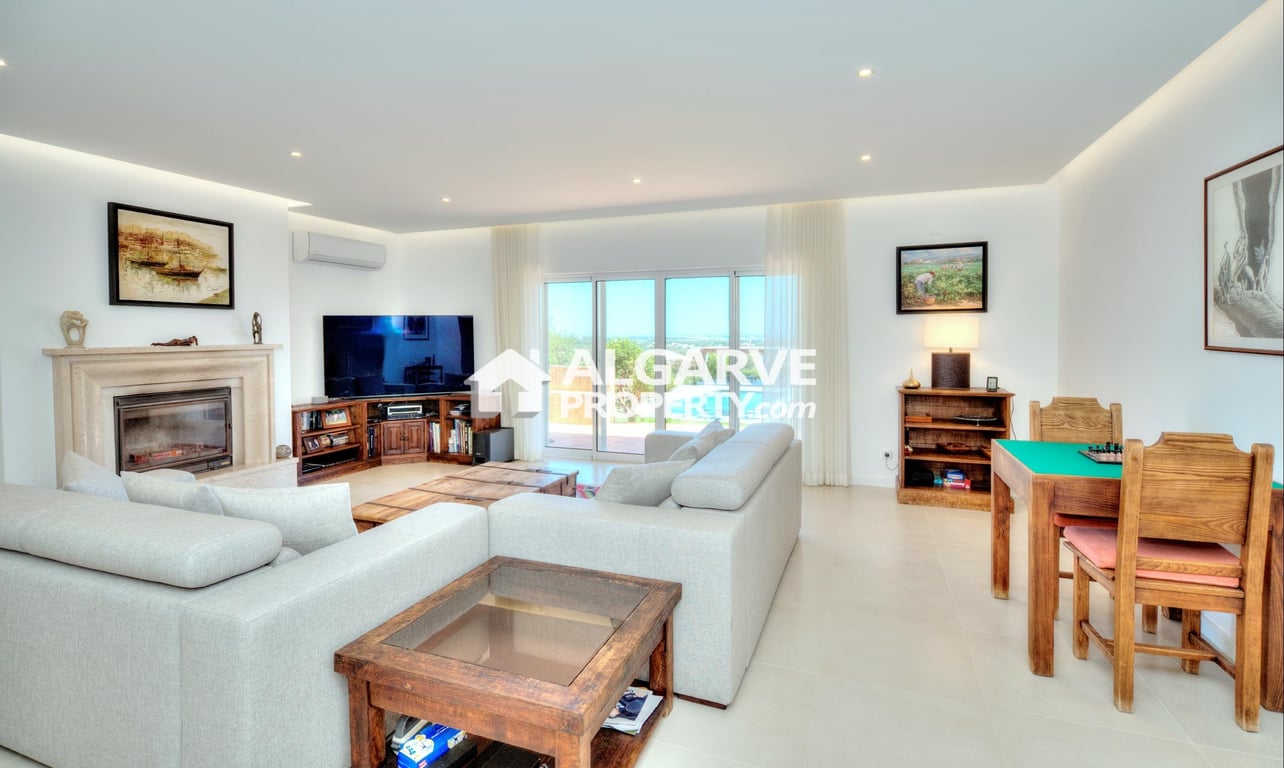 Situated in a quiet, elevated position near the traditional village of Boliqueime, this detached 5+1 bedroom villa offers expansive views across the countryside and out to the sea. Accessed via a palm-lined driveway, the property sits on a substantial 3,610 sq.m. plot with a practical 310 sq.m. built area. A significant advantage of this property is its fully wheelchair-accessible design. Ground Floor: The entrance lobby opens into a central hall, leading to a living room equipped with a highly...