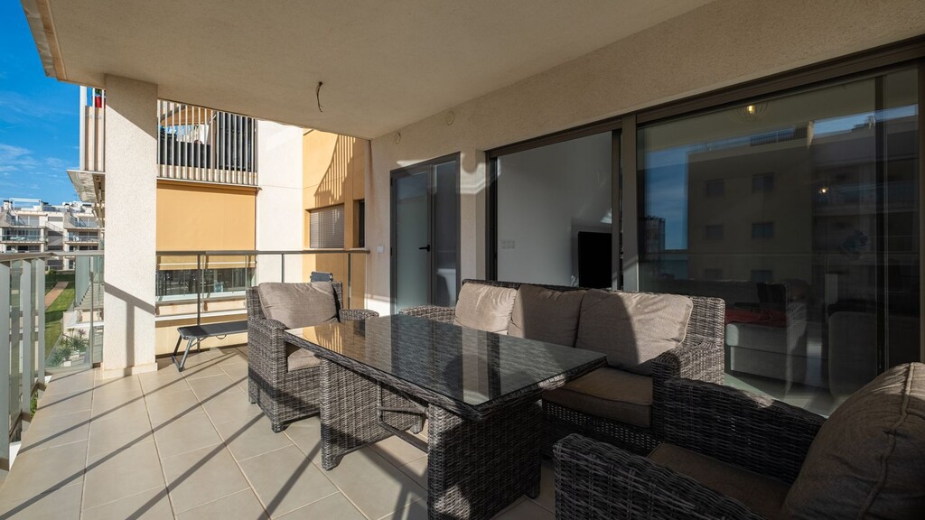 APARTMENT WITH 2 BEDROOMS AND 2 BATHROOMS, COMMUNAL POOLS, AIR CON, TERRACE, PARKING, VILLAMARTIN InterProperty Sales are delighted to offer this modern apartment with two spacious double bedrooms and two generous bathrooms, with the master bedroom featuring an en-suite bathroom for maximum comfort and privacy. The open-plan layout creates a harmonious sense of space, naturally connecting the kitchen, dining area, and living room – perfect for both relaxation and social gatherings. From the l...