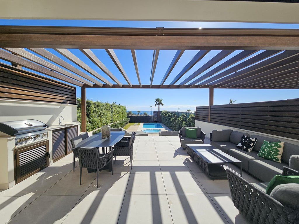 This beautiful house is located in an enviable beachfront position within the prestigious Velaya development on the New Golden Mile, offering breathtaking sea views and direct access to the beach. The property is spread over 3 floors taking full advantage of its south orientation, with fabulous views and all day sun. On entering, you are immediately greeted with the most stunning views across the garden to the sea. The ground floor offers a contemporary open plan living area with a sleek minima...