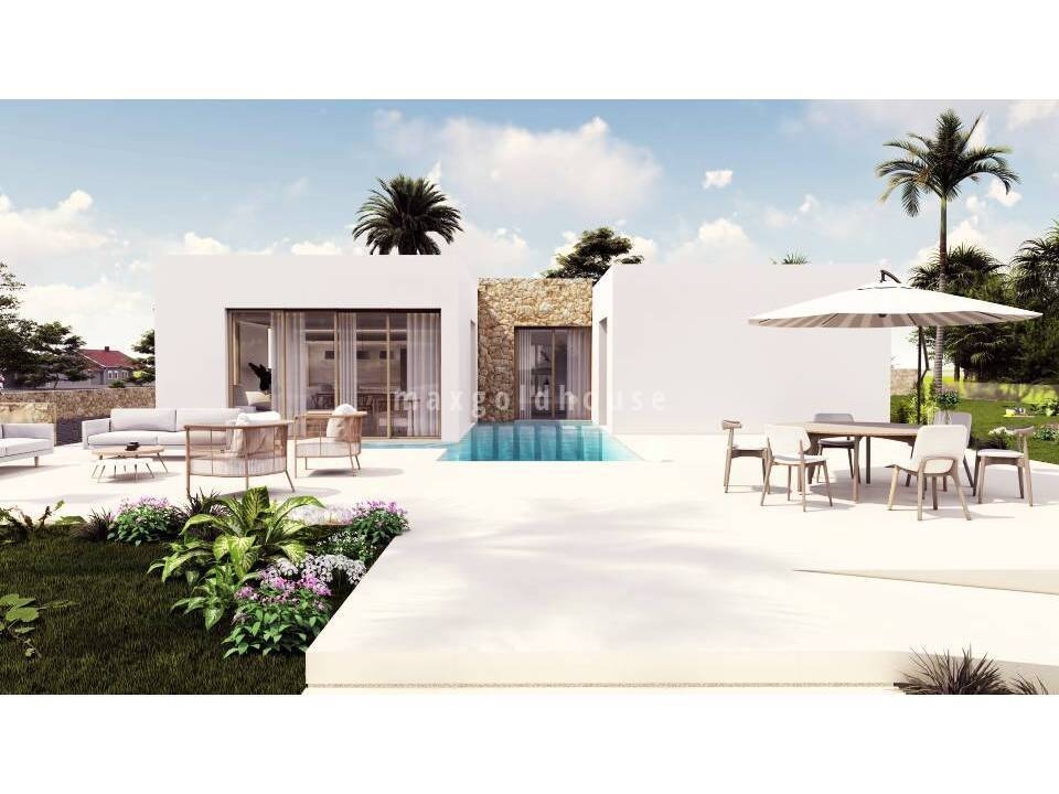 2 luxury one level villas for sale, a smaller version and a bigger version (our ref. NEW-0005b). The smaller villa will be built on a 10000 sqm plot, and has 199 sqm living area. It consists of 4 bedrooms, 3 bathrooms, 1 guest toilet, laundry room, and a very bright, spacious and open living / dining room and open kitchen. There is the option for a basement, wine cellar and gym. Included in the price is a private pool, solarium, automatic blinds, BBQ area with extra bathroom and storage room, co...